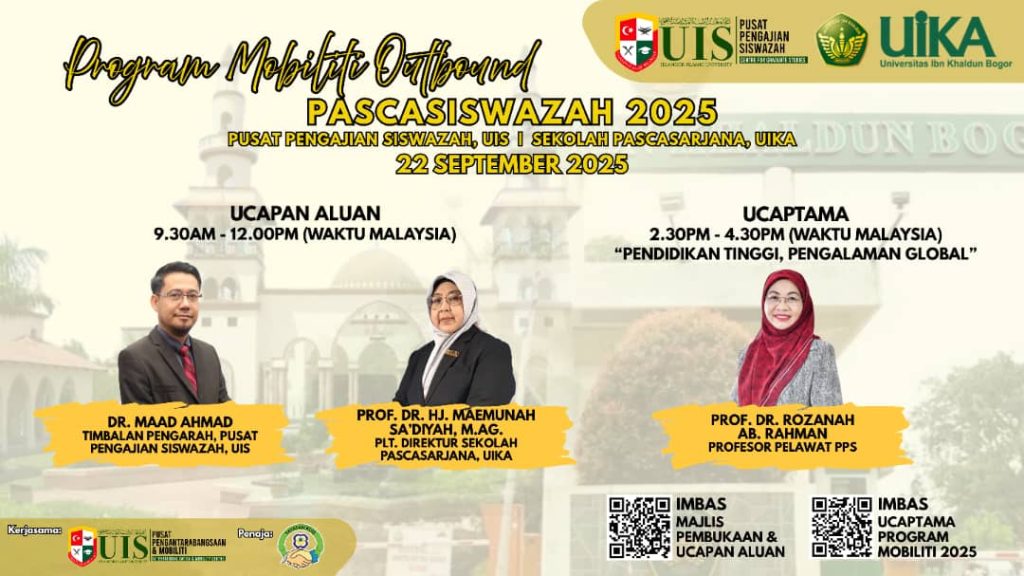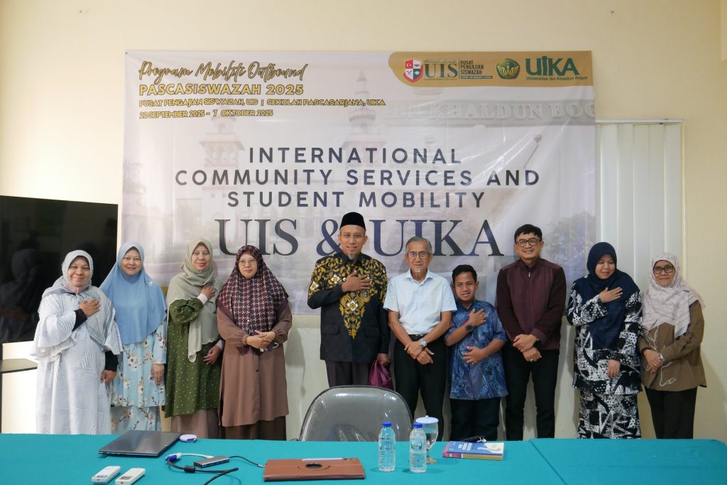 Bogor, 2025 – Sekolah Pascasarjana Universitas Ibn Khaldun (UIKA) Bogor bersama Pusat Pengajian Pascasiswazah Universiti Islam Selangor (UIS), Malaysia sukses melaksanakan program International Community and Student Mobility 2025 secara daring pada 22–30 September 2025, dilanjutkan secara offline dengan seremonial penyambutan oleh SPs-UIKA Bogor pada 2 Oktober, dan short course pada 3 Oktober 2025. Kegiatan ini menjadi wujud nyata kolaborasi internasional antara dua institusi Islam terkemuka dalam penguatan akademik, penelitian, dan pengabdian masyarakat lintas negara.